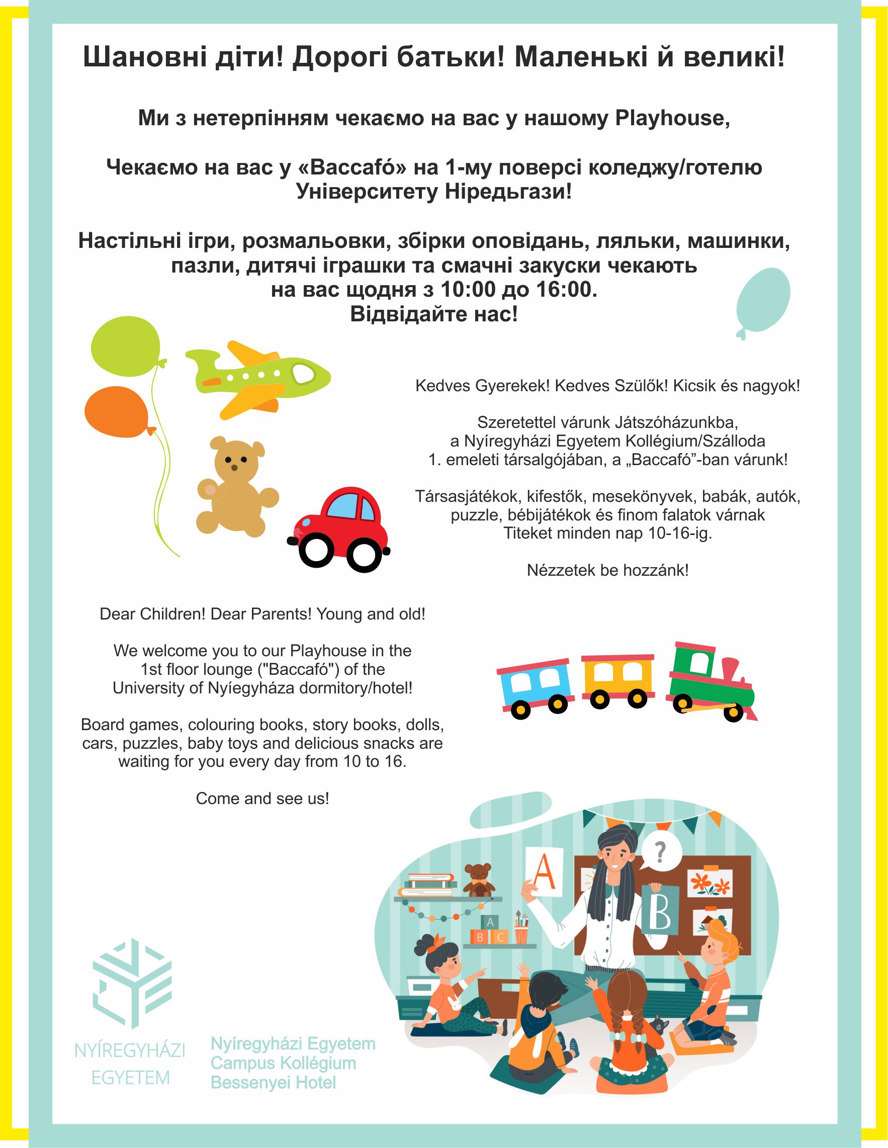 Bizonyára Önökhöz is eljutott annak híre, hogy háború dúl Ukrajnában, menekülésre kényszerítve a polgári lakosságot. Humanitárius segítségnyújtásunkat a Nyíregyházi Egyetemen is gyakorolhatjuk oly módon, hogy a Szociálpedagógia és Közösségszervezés Tanszék által kialakított "JÁTSZÓHÁZ" minden nap 10 órától nyitva van és fogadja azokat a gyerekeket, akiket az Egyetem Kollégiumában tudnak elszállásolni szüleikkel együtt. A Játszóház a Bessenyei Hotel "Baccafó" termében került kialakításra.